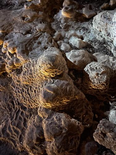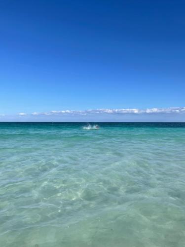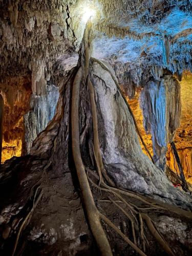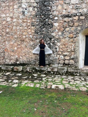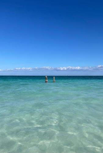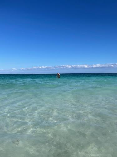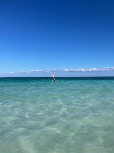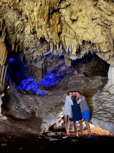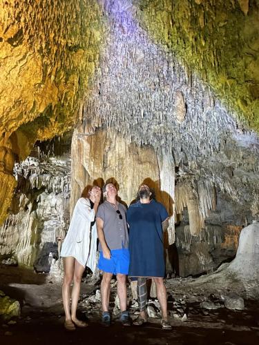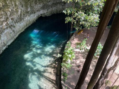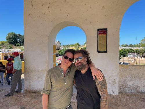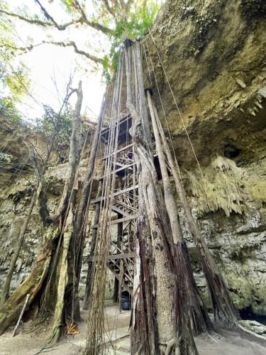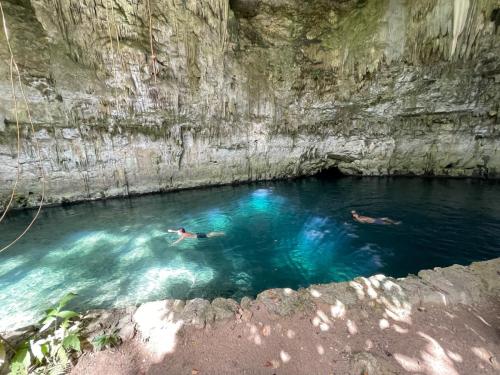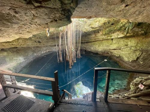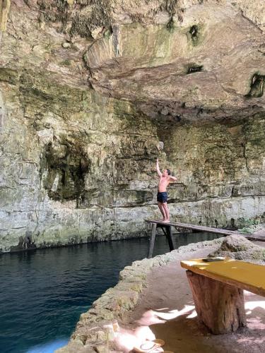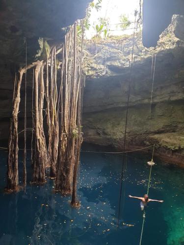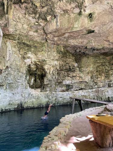 Während wir am ersten Tag in El Cuyo den Kitesurfer:innen beeindruckt zuschauen, versuchen uns über die letzten drei Monate unserer jeweiligen Leben auf den neuesten Stand zu bringen, es uns zur Aufgabe machen, alle Gerichte auf der Speisekarte unseres Lieblingsopis auszuprobieren, und Falkos Mitbringsel aus Cancun – hochwertigsten Tequilla – verköstigen, beschließen wir, am mittleren unserer 3 Aufenthaltstage ein Cenote zu besuchen. Dabei landen wir nach 1,5 Stunden Autofahrt und geschätzt 734 Bremshügeln zuerst in einem Dorf, in dem uns zwei Anwohnerinnen mit viel Gekicher mitteilen, dass hier nur der Dorfname „Cenote Azul“ ist, aber es keinen wirklichen Cenote gibt, finden aber eine halbe Stunde später dann eine „echte“ Cenotenlandschaft namens Cinco Cenotes, wobei hier von den 5 Cenoten gerade nur einer zugänglich ist, da die anderen 4 gewartet werden. Als einzige Besucher haben wir das ganze Areal für uns, kühlen uns kurz in der mit Sonnencreme beschichteten Wassergrotte ab, lungern dann noch ein bisschen in Hängematten herum und müssen aufgrund der Zeitverschiebung, die wir bei unserer Autofahrt in den angrenzenden Bundesstaat komplett übersehen haben und die uns 1 Stunde näher an das Ende der Öffnungszeit geschupst hat, unseren Cenotenbesuch sehr bald wieder beenden. Zum Trost gibt es nach dem 439. Bremshügel am Heimweg noch Tamales am Straßenrand. Am letzten Tag in El Cuyo wird ein letztes Mal der Strand genossen und darüber sinniert, was wir uns von Falko eigentlich alles importieren hätten lassen sollen. Dabei sind wir uns über eines einig: a guats Salamibrot warat’s  g’wesen!