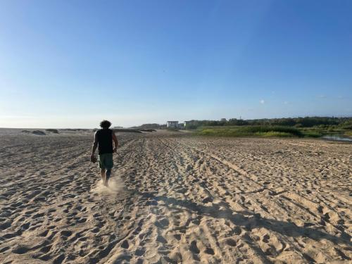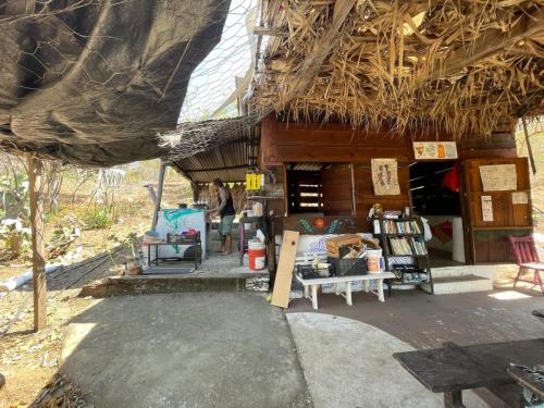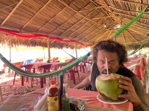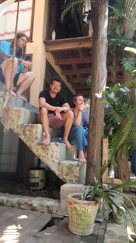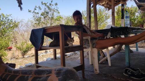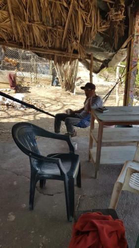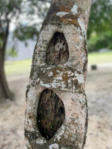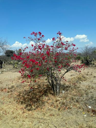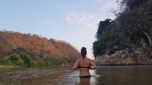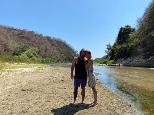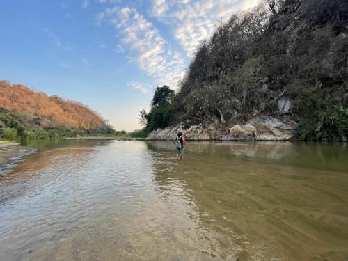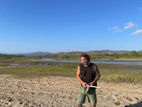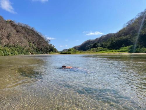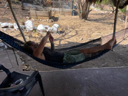 Um uns vom reinen Touristen-Dasein möglichst gut zu distanzieren, haben wir in Oaxaca über die Workaway-Plattform wieder einige mögliche Gastgeber:innen kontaktiert. Als wir eine Zusage für eine Ranch am Fluss Colotepec erhalten, bemüht sich Sabrina darum, mit der alten Dame, in deren kleiner Pension wir untergebracht sind, 2 der 3 gebuchten Nächte zu stornieren. Nach 1 Stunde Gespräch über Kommissionen von Booking.com und entsprechende Umgehungsmethoden sowie über die Besonderheiten in der Administration und Versteuerung von Pensionen in Mexiko, müssen wir nur die erste Nacht bezahlen und machen uns am nächsten Tag nach dem Besuch des Strandes Bacocho, der uns mit durchaus beängstigenden Wellen unsere Nebenhöhlen durchspült, schließlich auf zur Rancho „Cuatro Elementos“. Bei der Anfahrt über die steinige und steil abwärts geneigte Staubstraße sind wir erst mal froh, dass wir das Mietauto Vollkasko versichert haben, aber auch skeptisch, ob wir hier jemals wieder heil zurück hinaufkommen. Herzlich begrüßt von Fernando, seiner Partnerin Crista sowie ihren 4 Hunden, beziehen wir unser Quartier: eine einfache Hütte mit Moskitonetzfenstern und etwas in die Jahre gekommene Betten mit Matratzen, wo nicht nur der 3D-Effekt, sondern auch der Soundeffekt der Metallfedern bei jeder Drehung zu seiner vollen Wirkung kommt. Strom oder Internet haben wir dort nicht, und auch unsere mexikanische eSIM bringt in diesem Funkloch reichlich wenig. Ehrlich gesagt stört uns das aber kein bisschen.