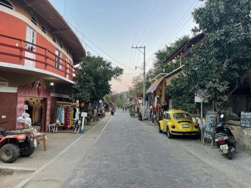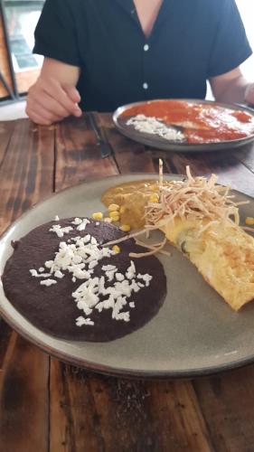 Auch wenn es nahezu eine Schande ist, das Erlebnis, das mit der Nutzung mexikanischer Colectivos (Sammeltaxis) einhergeht, auszulassen, entscheiden wir uns dafür, für die nächsten 2 Wochen einen fahrenden Gepäckträger zu mieten. Von unserer Unterkunft nehmen wir gleich mal einen englischen Tätowierer und Künstler namens Rossi mit, der das gleiche Ziel hat: Puerto Escondido. Rossi hat nicht nur jede Menge Spraydosen im Gepäck, um auf seiner Reise ein wenig Farbe an diversen Wänden zu hinterlassen, sondern sorgt außerdem mit endlosen, aber spannend erzählten Geschichten über prähispanische Hochkulturen in Mexiko dafür, dass die 3-stündige Autofahrt wie im Flug vergeht. Als Dankeschön werden wir am Ziel zum Fischessen eingeladen und tauschen Kontakte aus, um in den nächsten Tagen mal gemeinsam ins Meer zu hüpfen.