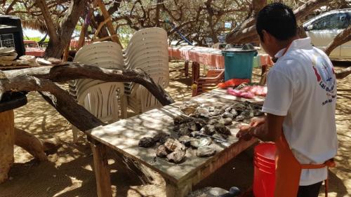Schweren Herzens geben wir nach einer Woche unser reduziertes Leben auf der Ranch wieder auf und bleiben am Weg nach Mazunte in dem kleinen Badeort Agua Blanca stehen, wo wir Chilaquiles frühstücken, dazu eine frische Kokosnuss schlürfen und einem Küchenchef beim Öffnen von Austern zuschauen, die uns als Vormittagssnack noch etwas zu wild erscheinen. Auch dort gibt es wieder jede Menge starke Wellen, die wir mit reichlich Vorsicht genießen, und beim Blick aufs offene Meer dürfen wir sogar aus etwas weniger Entfernung als in Hawaii noch mal zwei Wale beim – wie es aussieht – gemeinsamen Herumalbern beobachten.