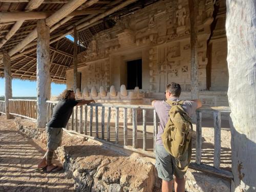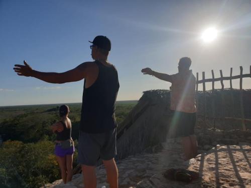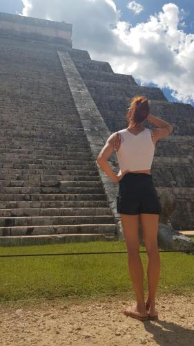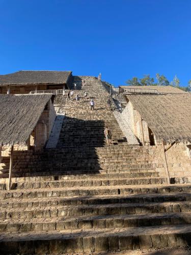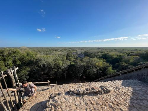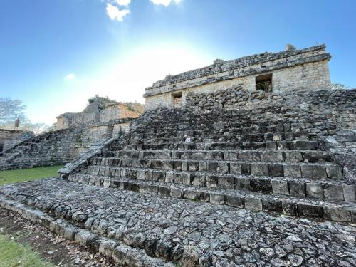 Um der schattenlosen Hitze der Stadt zu entgehen, besuchen wir dann noch an einem unserer Tage in Valladolid den nahegelegenen Cenote Sac Aua, der uns vom Gastgeber unserer Unterkunft als einer der schönsten und touristisch nicht allzu stark frequentierten Cenoten empfohlen wird. Dort machen wir eine kleine Grottentour und erfahren, dass es in Yucatan insgesamt über 10000 Cenoten geben soll und dass diese zu 99% unter Silberpappeln zu finden sind. Wir werden außerdem über die Traditionen und Riten der Maya eingeweiht, die ihren Göttern in den Cenoten meist Menschen geopfert haben – vorwiegend Kleinkinder sowie die Stärksten und Schönsten. Unseren Vermutungen zufolge war das wohl dann der Niedergang des Schwanenhals-Gens in Yucatan. Jedenfalls glücklich in einer etwas anderen Zeit zu leben, hüpfen wir nach dem Besuch der Grotte noch einmal in das glasklare Wasser des angrenzenden Cenotes und fahren anschließend noch zu einer über dem Erdboden befindlichen Mayastätte: Ek Balam. Dort steht die einzige Pyramide in Mexiko, deren Stufen man tatsächlich auch hinaufgehen darf, und wo wir vom Zenit aus schließlich sehen können, wie sich der unberührte Dschungel hier kilometerweit über das flache Land erstreckt und offensichtlich noch nicht Monokulturwirtschaftspraktiken zum Opfer gefallen ist. Unsere der Umwelt nahestehenden Herzen erfreut das jedenfalls.