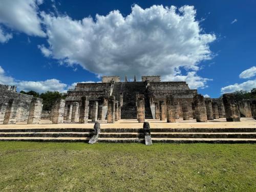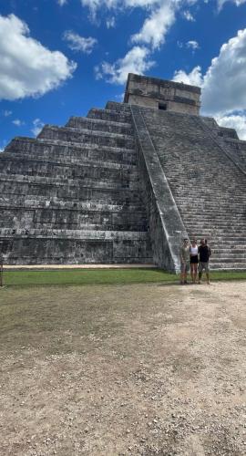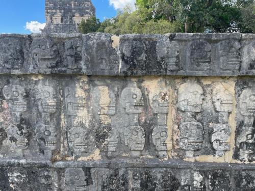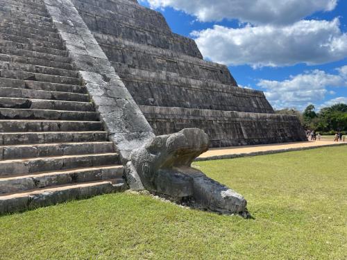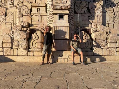 Der Mayakultur auf der Spur – so dachten wir bis dahin zumindest – statten wir auf der Überfahrt von Valladolid nach Merida dem bereits zweiten Weltwunder auf unserer Reise einen Besuch ab: Chichen Itza. Unser Tourguide Mario klärt uns aber gleich zu Beginn auf, dass wir hier im Grunde vielmehr ein Kulturerbe der Tolteken als der Maya vor uns haben und wird auf der nahezu 3-stündigen Tour zu keiner Zeit müde, uns nahezu jeden Stein sowie jede Pflanze am Gelände zu erklären und mit viel Freude auf Falkos Fragentirade einzugehen. Allzu viel tatsächliches Wissen scheint es aber über diese Zeit nicht zu geben, sondern nur mehr oder weniger wahrscheinliche Theorien. Womit Mario jedoch unsere zwischendurch bereits erschöpften Ohren jedes Mal erneut zum Schlackern bringt, ist das viele Herzblut, das er in die Aussprache der originalen Götternamen steckt – wenn er also die Augen weit aufreißt und tief in die Knie geht, um uns dann mit starken Händen, die vor seinem Körper einen imaginären Ball zum Platzen bringen, und mit knackenden und krachenden Lauten für uns nahezu unaussprechliche Silben entgegenwirft. Kaum zu glauben, dass er vor über 1500 Jahren nicht selbst mitgeholfen hat, die vielen Steine aufeinanderzustapeln.