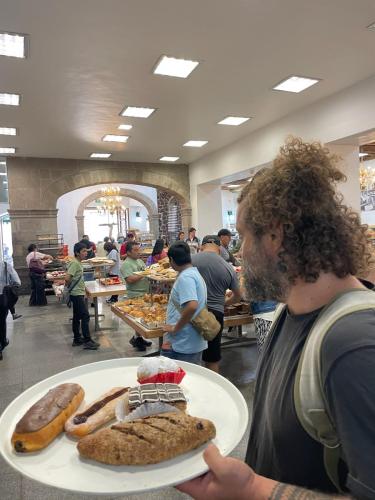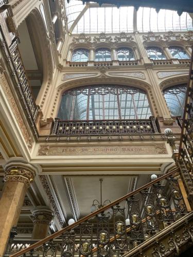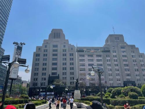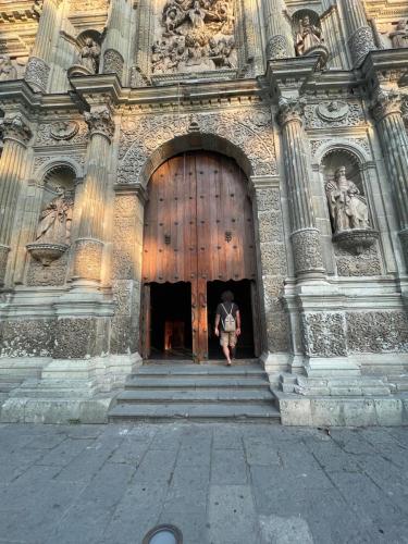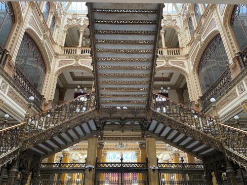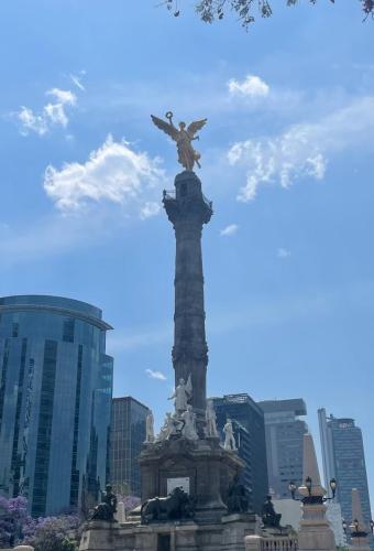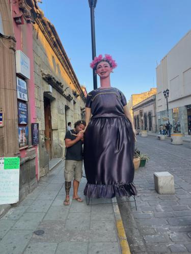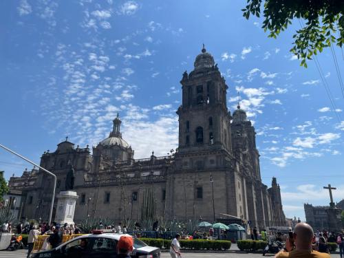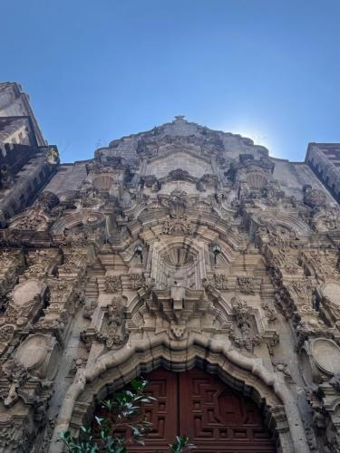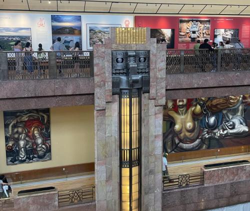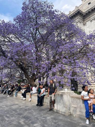 Unsere Gegend ist nahezu unwirklich grün und beherbergt viele Wohnhäuser, die in ihrer Architektur dem österreichischen Altbaustil sehr nahe kommen und zusätzlich sehr viele verspielte und verschnörkelte Züge aufweisen. Auch bei der 3-stündigen Free Walking Tour durch die Stadt treffen wir auf haufenweise imposante Bauwerke, die eine lange Geschichte verraten und die Mexiko City gar nicht so „böse“ erscheinen lassen wie es die vielen wilden Geschichten suggerieren. Von unserem Tourguide Miguel, einem jungen und ambitionierten Geschichtelehrer, erfahren wir, dass sich vor allem Porfirio Diaz Anfang des 20. Jahrhunderts zum Ziel gesetzt hat, aus Mexiko City eine „City of Palaces“ zu machen und dabei die Meinung vertrat, dass die Stadt nur mit europäischer Baukunst wirklich schön werden würde. Und auch wenn es natürlich schade ist, um all die Pyramiden und aus Stein errichteten Stätten der prähispanischen Hochkulturen, so können auch wir dem nur zustimmen, dass diese monumentale und aber auch sehr feinen Baustile der Stadt jedenfalls einen besonderen Flair verschaffen. Dazu kommen aber auch noch die vielen Grün- und Freiflächen, die zum Zeitpunkt unseres Besuchs übersäht sind mit faszinierend violett blühenden Jacaranda-Bäumen. Miguel weiht uns während der Führung auch noch in viele mexikanische Legenden ein, die maßgeblichen Einfluss auf die Denkweise der Bevölkerung haben, und erzählt uns, dass die Mexikaner:innen außerdem Heilige für alles und jeden haben, so zum Beispiel auch für die Kartelle und Straßendiebe, die in schlechten Zeiten natürlich ihre Ikonenstatuen aufsuchen, um deren Unterstützung anzufordern. Außerdem bekommen wir Tipps, wo man sich in der Stadt gefälschte Reisepässe und Doktortitel kaufen kann, und erfahren, dass Mexiko City die Stadt mit den meisten Museen weltweit sein soll, weshalb wir nach der Stadtführung kurzerhand noch das Museo de Bellas Artes besuchen, das wie fast alle Museen der Stadt sonntags freien Eintritt hat und in dem viele spannende Ausstellungen unsere Äuglein verwöhnen.