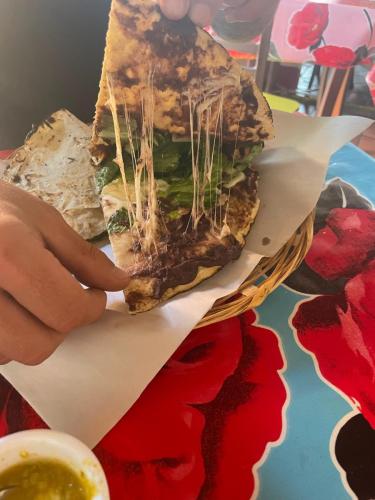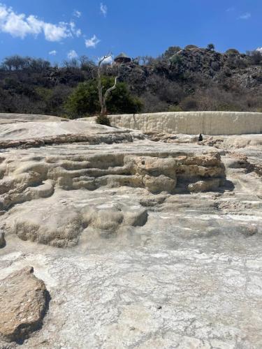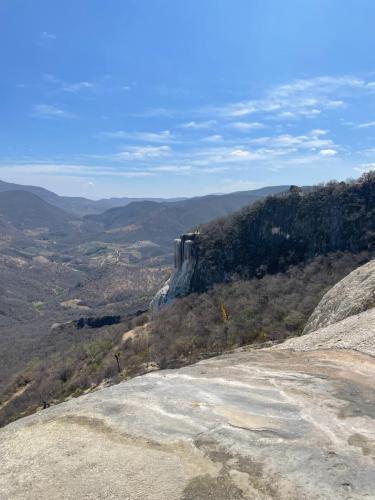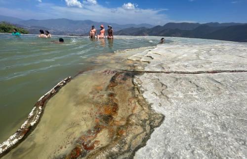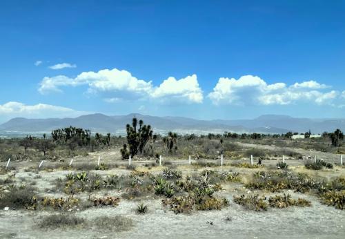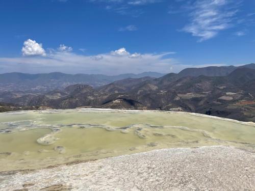 Auf unserem Weg zurück nach Oaxaca kommen wir noch mal an vielen Comedores (Imbisse am Straßenrand) vorbei, an denen über Feuer gekocht wird und erleben an dem „Instagram-tauglichen“ Schauplatz Hierve el Agua touristisch das absolute Kontrastprogramm zu San Jose del Pacifico. Die Gesteinsformationen, die wie schmelzendes Kerzenwachs aussehen und kleine Wasserreservoirs bilden, sind wirklich schön anzusehen, würde es dort nicht von Menschen wimmeln, die sich in knalliger und extrem unpraktischer Kleidung in den Wasserbecken räkeln oder mit Stöckelschuhen über die unzähligen Stufen stolpern, nur um ein Instabild mit nachhause zu nehmen. Wir bleiben also nicht allzu lange und entscheiden uns bei der Weiterfahrt für eine Strecke ohne Maut, die uns zwar über einen unasphaltierten und sehr steinigen Weg, aber gleichzeitig über einen Bergkamm führt, der einen unglaublichen Ausblick bietet. Außerdem kommen wir so durch viele bunte und kaktusgesegnete Dörfer hindurch, die nun erstmalig so richtig stereotypisch mexikanisch aussehen. Von dem hohen Konzentrationsaufwand beim Autofahren in Mexiko bereits äußerst erschöpft, aber ohne in einem Schlagloch verloren gegangen zu sein, bei einem der tausenden Bremshügel die Achse gebrochen zu haben, einen Polizisten bestechen zu müssen oder bei einer vorgetäuschten Autopanne ausgeraubt zu werden, geben wir unser Auto schließlich in Oaxaca wieder ab. Vom Autofahren haben wir jetzt vorerst mal wieder genug.