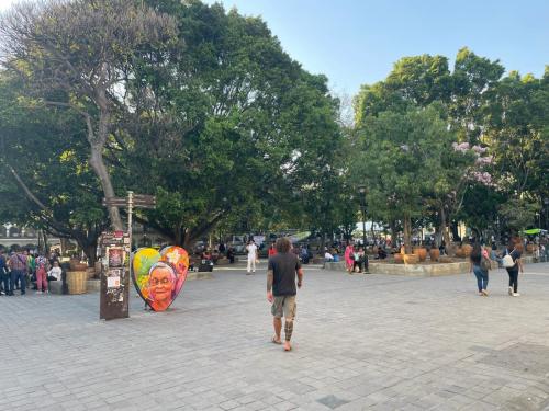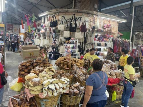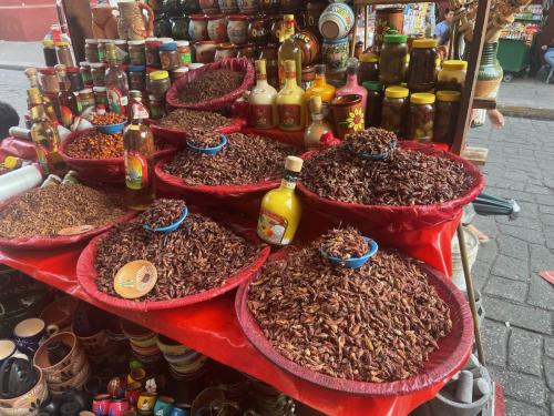 Bei einem Spaziergang in das Stadtzentrum finden wir dann all das, was uns bei den Stadtbesuchen in unseren ersten 2 Wochen in Mexiko gefehlt hat: architektonisch beeindruckende und geschichtsträchtig wirkende Gebäude am Rande breiter Fußgängerzonen sowie große schattige Bäume inklusive(!) Sitzgelegenheiten und dadurch um einiges mehr an Gemütlichkeit. Natürlich gibt es auch hier einige auswärtige sowie mexikanische Touristen, aber dadurch, dass diese Stadt sicher auch ohne Touristen überleben kann und nicht so wirkt, als wäre sie nur für den internationalen Tourismus gebaut, fühlen wir uns hier schon sehr viel wohler und erfreuen uns auch an etwas landesüblicheren Preise. Es gibt hier so viele schöne Ecken, Märkte und bunte Straßen, dass man auch gar kein Alternativprogramm zur Flucht aus der Stadt benötigt. Wir nutzen die 3 Tage in Oaxaca de Juarez daher, um durch die Stadt zu schlendern, die schöne Atmosphäre zu genießen, uns durch die Märkte und Restaurants zu schnabulieren sowie endlich den Mezcal von unserer Liste abzuarbeiten, der uns nicht nur kräftig durchschüttelt, sondern uns in den nächsten Stunden regelmäßig Grüße aus unserem (zugegebenermaßen viel zu) bunt gefüllten Magendarmtrakt schickt.