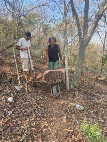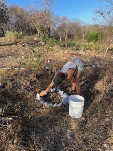Unsere Tage auf der Ranch starten meist mit Sonnenaufgang und sind geprägt von einer Nacht, in der Fernandos Hahn mit offensichtlich gestörter Weckfunktion ab 01:00 Uhr halbstündig kräht. Dann wird ein bisschen Holz gesammelt, Feuer gemacht und das Wasser für den ‚wunderbaren‘ Löskaffee oder Tee aufgestellt. Zwischen 07:30 Uhr und 08:00 Uhr taucht dann meist Fernando auf und verteilt Aufgaben, zu denen Folgende zählen: Gemeinschaftsbereich herrichten, Steinbegrenzungen für Wege und Bäume legen, diese neuen oder andere bereits verblasste Steine kalken, Teile des Grundstücks rechen, einen Wintergarten anlegen, die Tomatenzucht verbessern oder Wasser vom Fluss hinaufpumpen, um die Wassertanks zu befüllen. Größtenteils arbeiten wir dabei im Rhythmus der mexikanischen Volksmusik und dem dazu einstimmenden Gejodle der tacobäuchigen Bauarbeiter des Nachbargrundstücks. Um spätestens 10:00 Uhr ist dann aber wieder Schluss. Nicht nur, weil die Hitze sich zu dieser Zeit schon unangenehm bemerkbar macht, sondern auch, weil wir bei Fernando bis auf Wasser keine Verpflegung bekommen und er uns daher nicht allzu lange einspannen will. Nach Arbeitsende machen wir uns dann unser wohlverdientes Frühstück und quatschen dabei mit Fernandos einzigem, bezahltem Arbeiter Alejandro, der uns täglich etwas mehr über sein Leben, seine Träume, seine Familie und generelle Arbeitsumstände in Mexiko erzählt. Wir erfahren dabei, dass sein Verdienst pro Woche ca. 85 Euro beträgt, seine Frau, eine Reinigungskraft, verdient etwas mehr – den Lohn gibt’s wöchentlich direkt in die Hand, Sozialsystem gibt’s keines. Für den Kaiserschnitt beim 3. Kind müssen sie selbst aufkommen und schon ist das Familienbudget um 1.500 Euro geschrumpft.