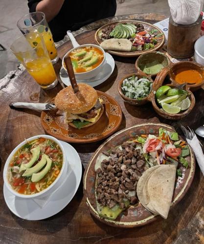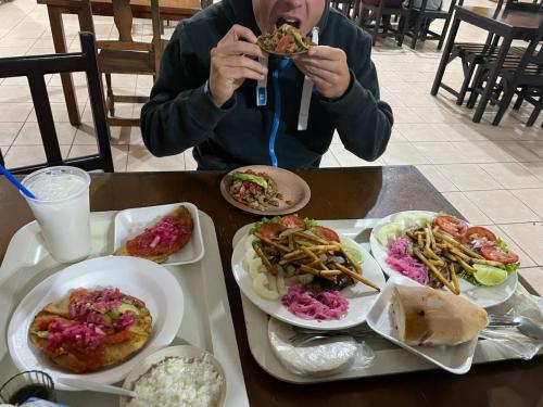 Unser nächster Stopp führt uns weg vom Strand in die kleine, aber feine Stadt Valladolid. Dort setzen wir vor allem unsere kulinarische Erkundungstour fort. Der Markt im Zentrum bietet nahezu 360° Fressbuden mit Budenschreiern, die ihre jeweiligen Speisekarten in Höchstgeschwindigkeit herunterleiern, um anschließend geduldig die immer gleiche Frage unsererseits zu den vielen uns unbekannten Gerichten zu beantworten: „Qué es esto?“ – oder zu steirisch „Und wous is des?“. Mit 3 Nächten und 3 hungrigen Mäulern schaffen wir es bis zum Ende unseres Aufenthalts jedenfalls mindestens 10 unterschiedliche traditionelle Gerichte Yucatans zu probieren. Unser Fazit: Vieles schmeckt sehr ähnlich und gesunde Küche ist was anderes. Unter dem Abschnitt „Vegetarisches“ – wenn es einen solchen auf der Speisekarte überhaupt gibt – findet man höchstens Gemüsetacos, Eiergerichte oder Salat (gelegentlich „sogar“ mit Huhn). Bei unseren anschließenden Verdauungsspaziergängen durch die Stadt stellen wir außerdem etwas enttäuscht fest, dass die Mexikaner:innen kein Volk des gemütlichen Verweilens sind. Und das nicht nur, weil die meisten Rückenlehnen von Sitzgelegenheiten sich teilweise am oberen Ende nach vorne neigen, sondern weil es auch ein Ding der Unmöglichkeit zu sein scheint, an einem größeren Platz oder in einem Park Cafes oder Saftbuden mit Gastgarten oder Ähnlichem zu finden, um von dort aus die Aussage eines Arbeitskollegen von Falko zu verifizieren, der Mexiko auch das „Land der Head and Shoulders“ nennt. Bei unseren Besuchen diverser Kathedralen und Klöster sowie unserem all-abendlichen Ausflug zum Abendessen auf den Markt und zur Kirchenshow im Zentrum von Valladolid lässt sich aber dennoch gut beobachten: einen Hals hat hier nicht ein jeder.