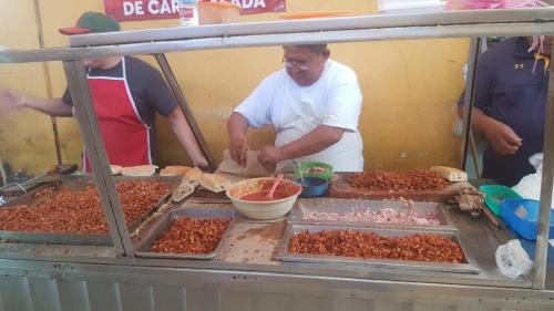 Mit Lust auf ein bisschen Tanzen zu elektronischer Musik ziehen wir am Wochenende in das Stadtzentrum, wo sich eine Karnevalfeier gerade dem Ende zuneigt. Uns fällt plötzlich auf, dass hier kein einziger Gringo-Tourist zu finden ist und wir uns in der Innenstadt erstmals inmitten einer rein mexikanischen Menschenmasse befinden. Bisher waren die einzigen Einheimischen, denen wir begegnet sind, Bauarbeiter oder Ladenverkäufer:innen. Auch wenn sich die Massen bereits von der Hauptbühne Richtung Fress- und Schießbuden schieben, an denen um Mitternacht noch Kinder im Volksschulalter ihren Eltern beim Familienstandl helfen oder mit dem Bauchladen Kaugummis verkaufen, kann man vielerorts noch Schunkelmusik vernehmen. Die umliegenden Clubs beschallen die Straßen außerdem mit Reggaeton, um möglichst viele Karnevalbesucher umgehend auf ihre Tanzflächen zu locken. Nachdem es musikalisch leider nicht wirklich was für uns gibt, nutzen wir den Abend schließlich, um auch uns an den Taco- und Tortaständen noch mal den Wanst vollzuhauen.
